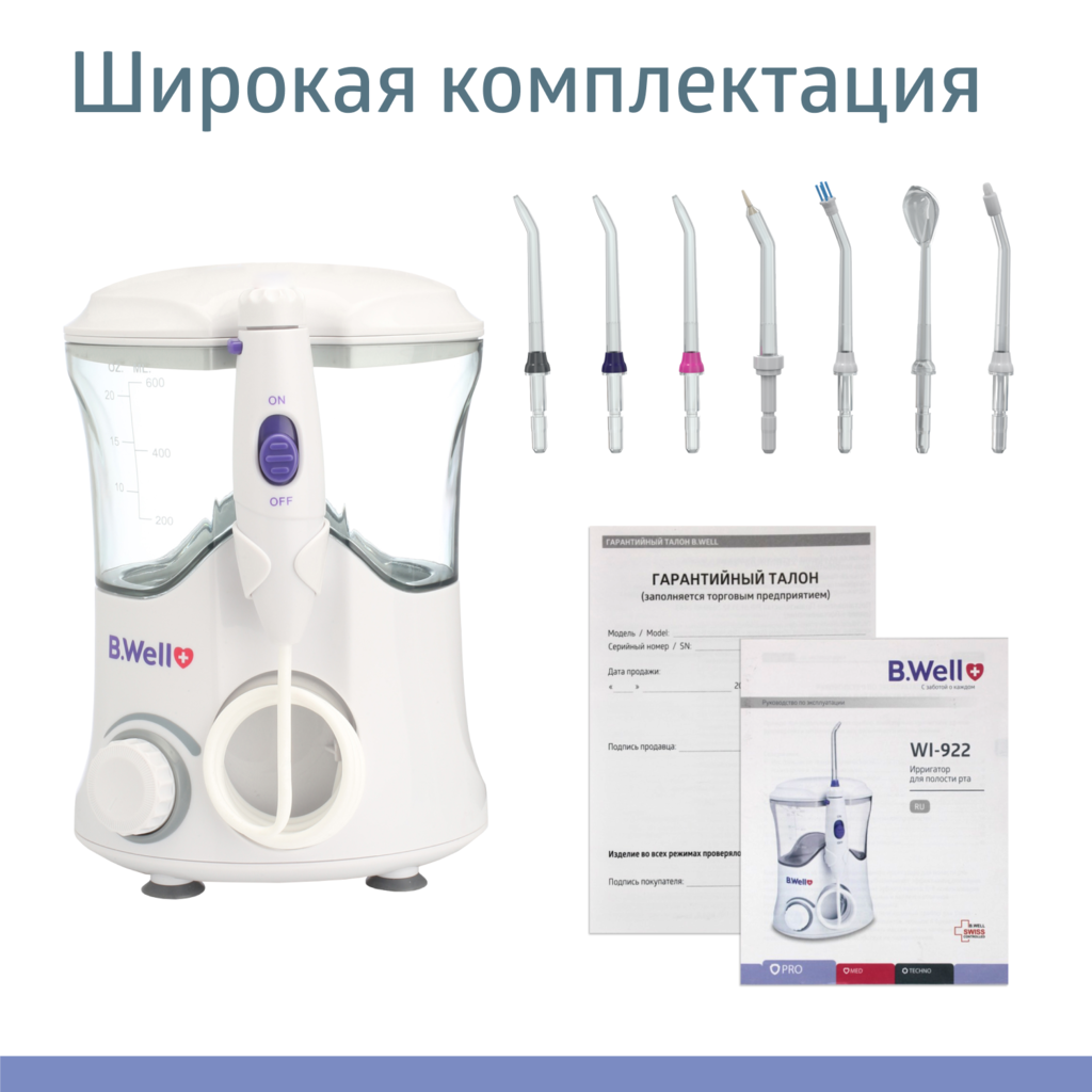 B.Well WI-922 - стационарный ирригатор для всей семьи. В этом приборе все предусмотрено для комплексного ухода за полостью рта и профилактики развития заболеваний слизистой оболочки полости рта. Может использоваться как в домашних условиях, так и в стоматологических клиниках при проведении лечебно-профилактических манипуляций в отношении полости рта пациента.